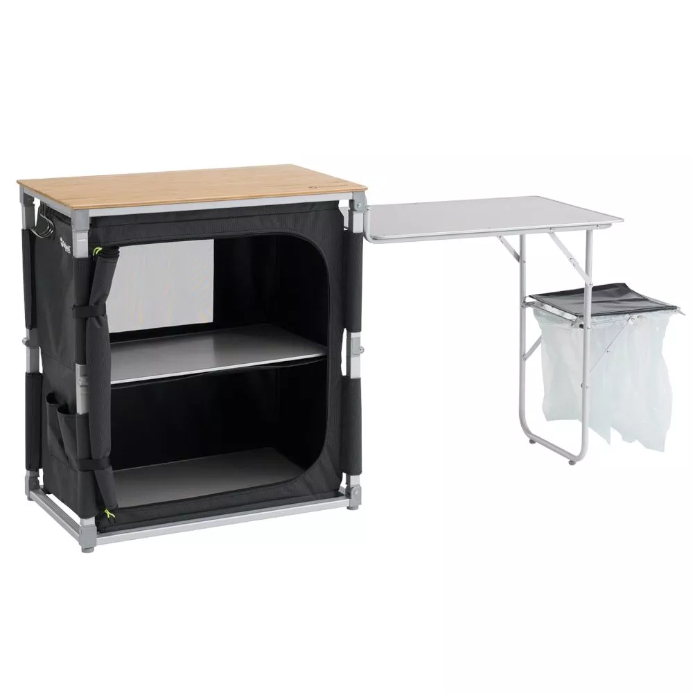 Der Küchenschrank Outwell Padres mit Beistelltisch ist die ultimative mobile Küche! Er lässt sich sekundenschnell aufklappen, sodass du die grosse Bambusarbeitsfläche, den Seitentisch, den ausziehbaren Abwaschschüsselhalter und den Mülleimer mit Deckel nutzen kannst.