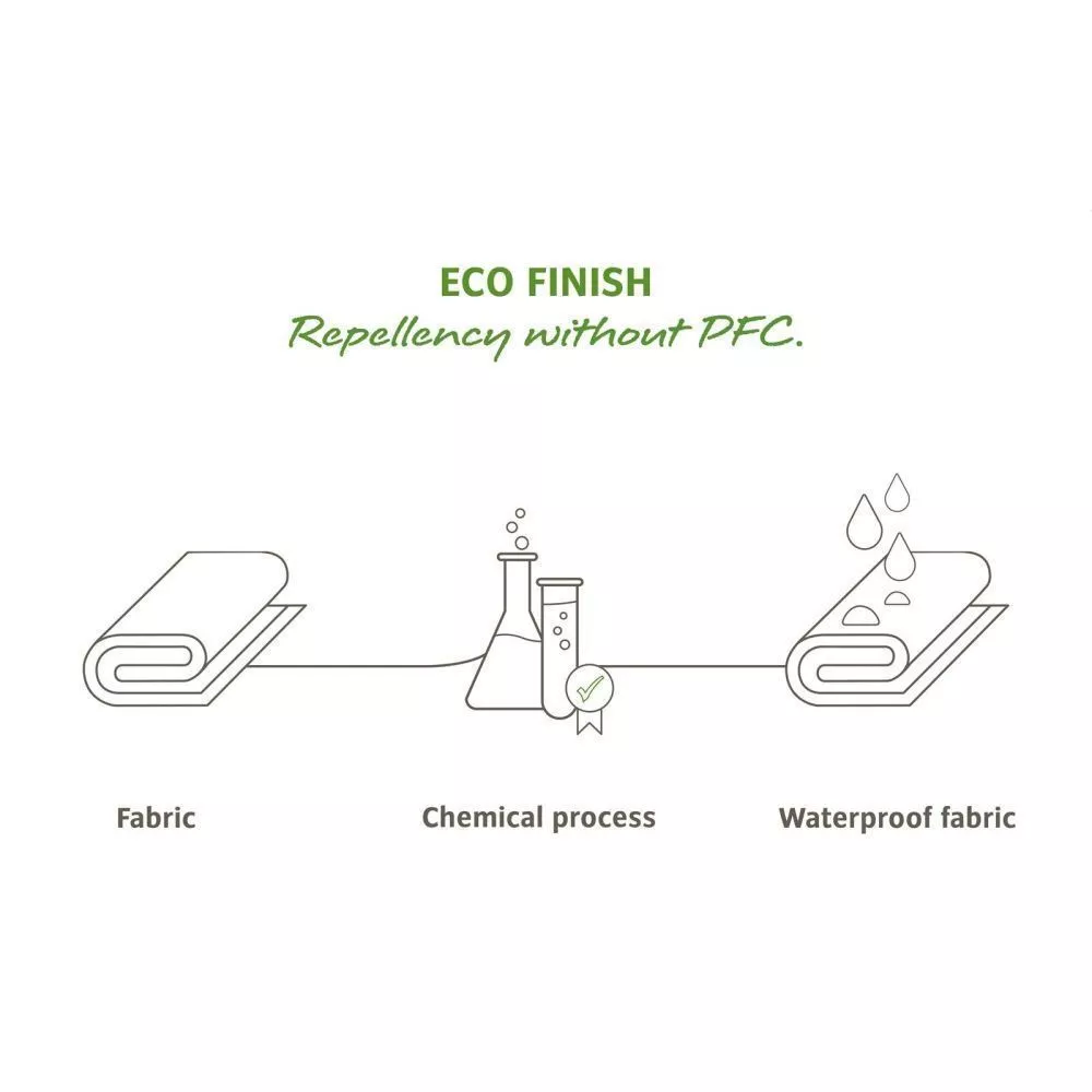 Diese wasser- und schmutzabweisende Ausrüstung wird auf den Oberstoff des Produktes aufgebracht. Dadurch perlen Regentropfen ab – und das ohne den Einsatz von umweltschädlichen Fluorcarbonen (PFC). Das schützt vor Regen und hält die Natur sauber. Für eine dauerhafte Wasser- und Schmutzabweisung ist eine regelmässige Nachbehandlung nötig.